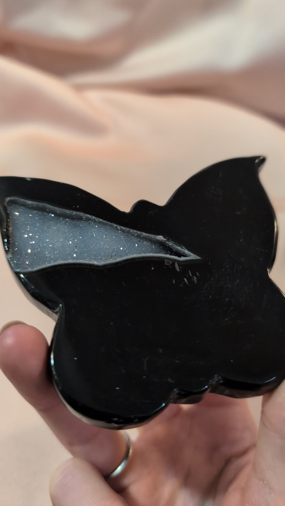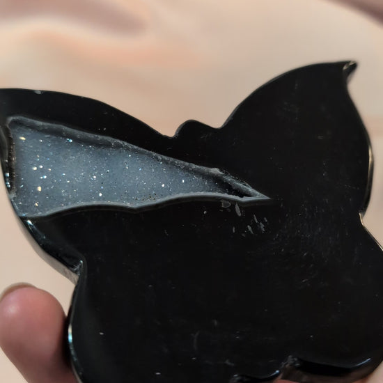 Dark, with a mirror- like polish, this Agate Butterfly is carved from genuine agate and features a druzy.