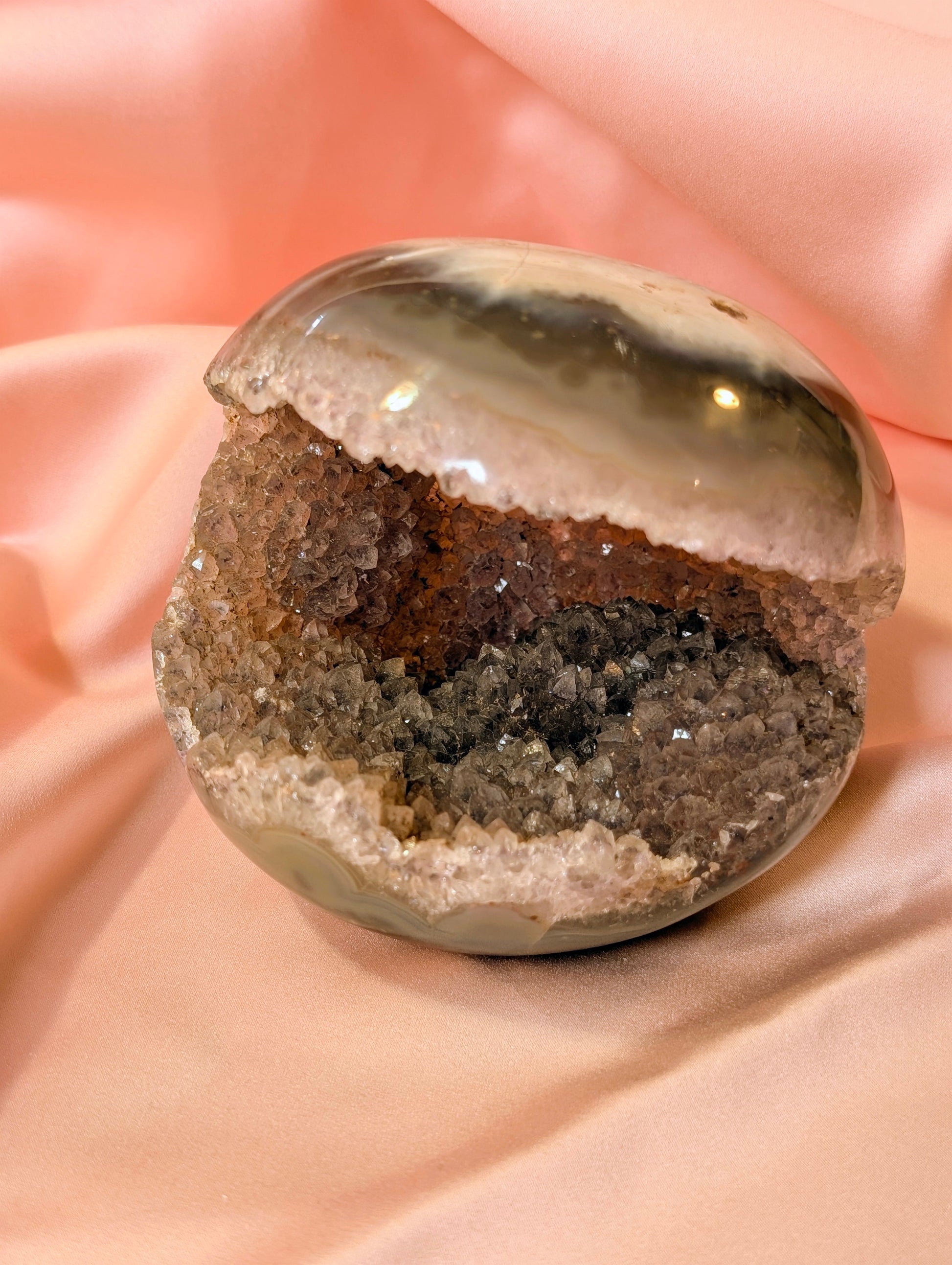 Large polished Agate Sphere with sparkling Druzy cave, carved from genuine agate and featuring unique natural banding and heart looking Inclusion.