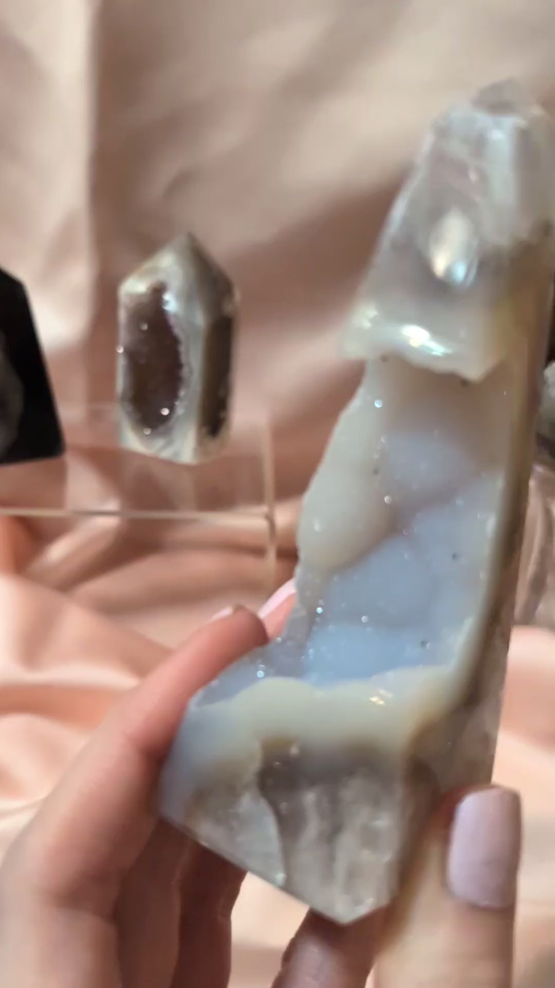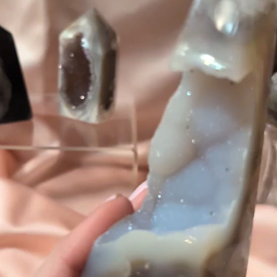High Quality polished Agate Tower, with large Druzy center, carved from genuine agate and featuring unique natural banding and a rainbow on its tip