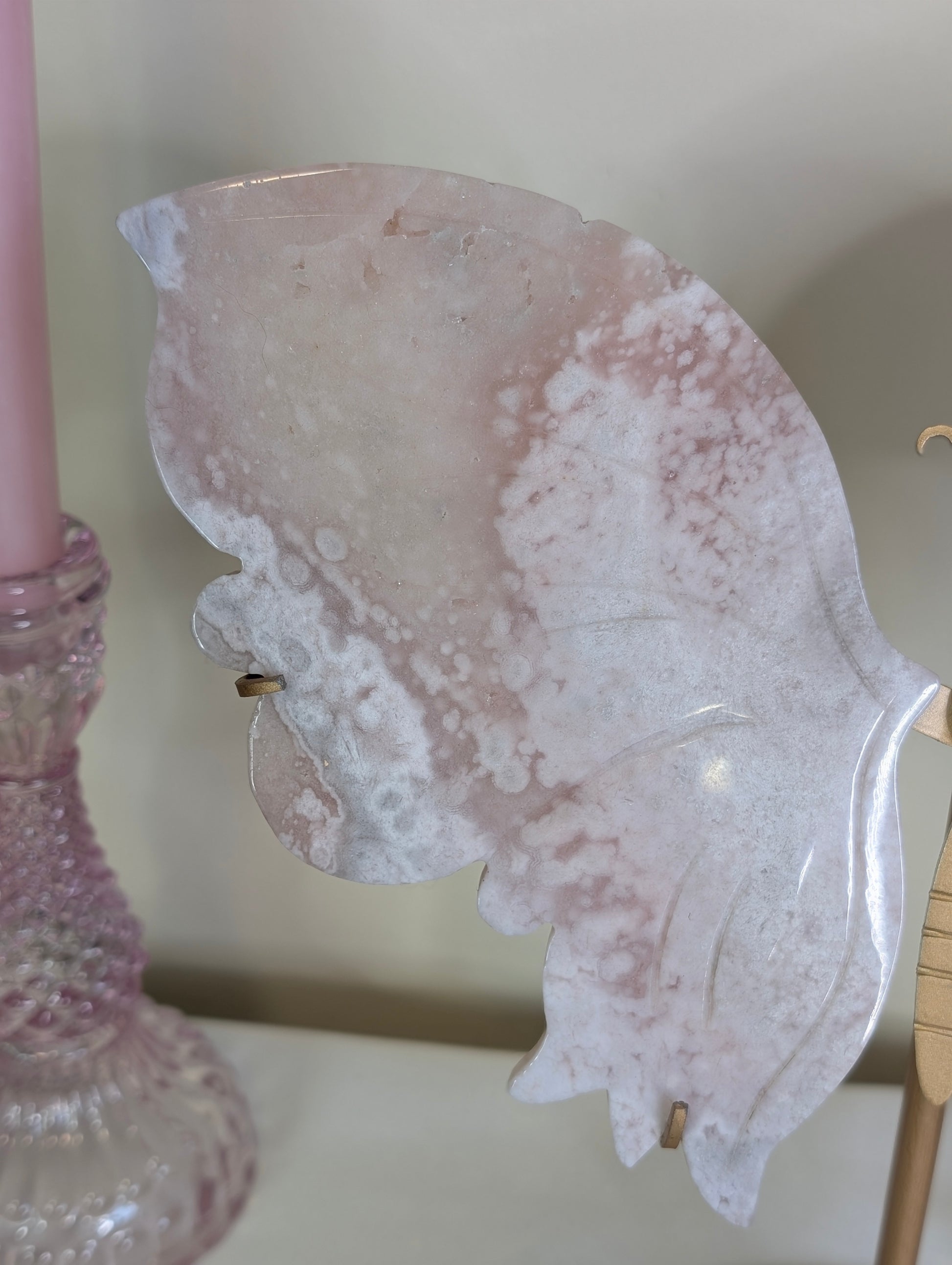 Delicate Flower Agate wings displayed on a custom stand, blending natural beauty with elegant craftsmanship—symbolizing growth, healing, and gentle transformation.
