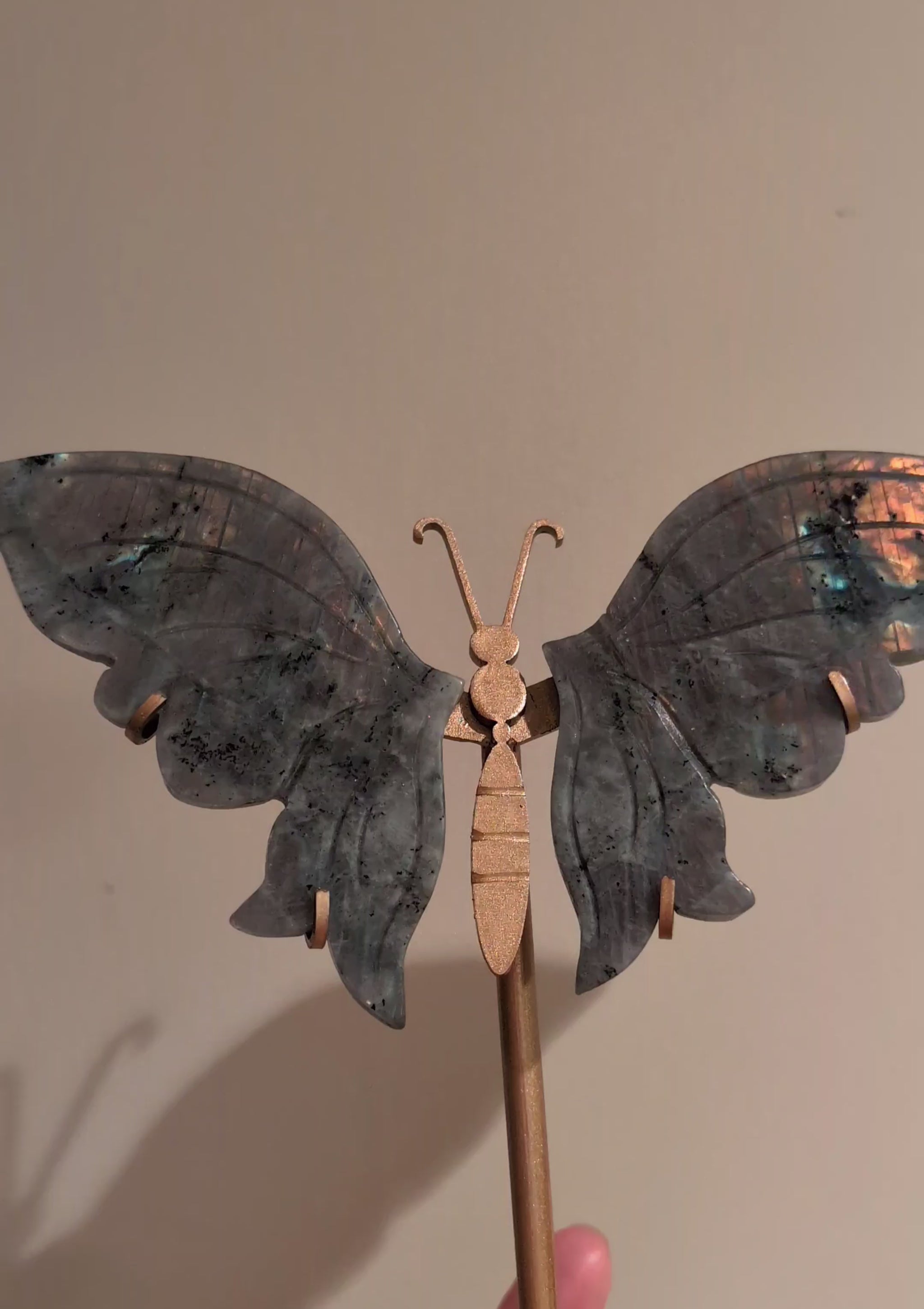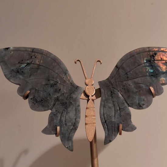 High Flash Labradorite Wings on custom stand. Labradorite is associated with transformation, intuition, protection, and spiritual awakening. These wings offer both beauty and energetic magic.