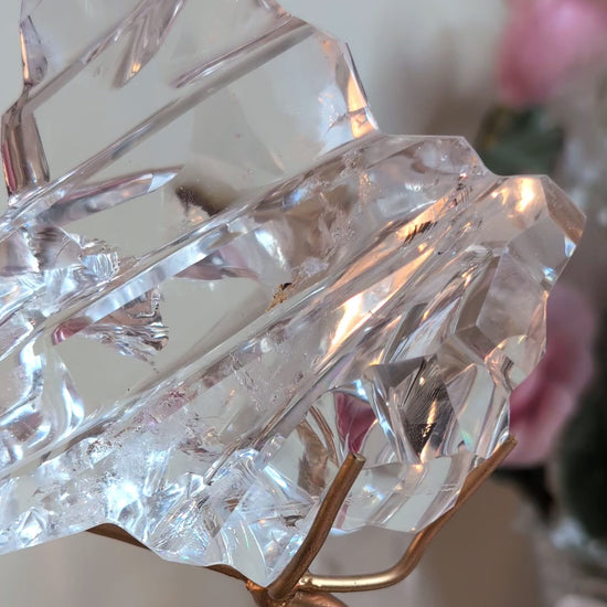 Cradled in a custom bronze stand, this polished Lemurian Quartz glows with ancient clarity and energy. It's a one of a kind carving from high end Lemurian Quartz, resembling an Ice Sculpture, perfect to reflect and radiate light and energy throughout.