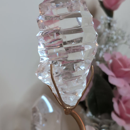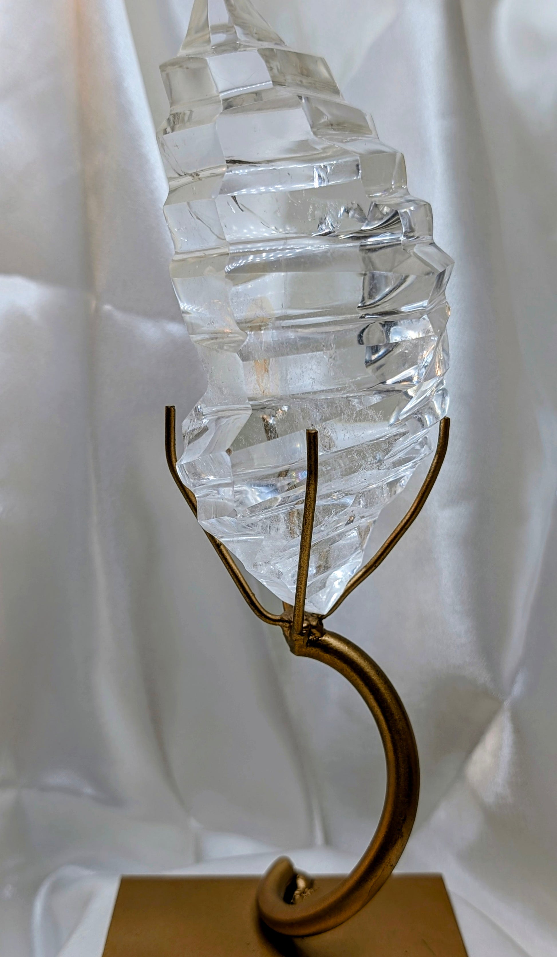 Cradled in a custom bronze stand, this polished Lemurian Quartz glows with ancient clarity and energy. It's a one of a kind carving from high end Lemurian Quartz, resembling an Ice Sculpture, perfect to reflect and radiate light and energy throughout.
