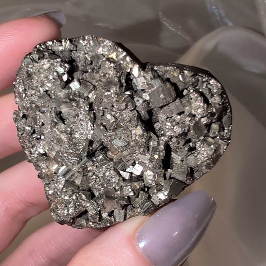High-quality natural pyrite from Peru, known for its bright metallic luster and striking shapes. Metaphysically used for attracting abundance, protection, and confidence. This hand polished heart shape shows off the beauty of the formations.